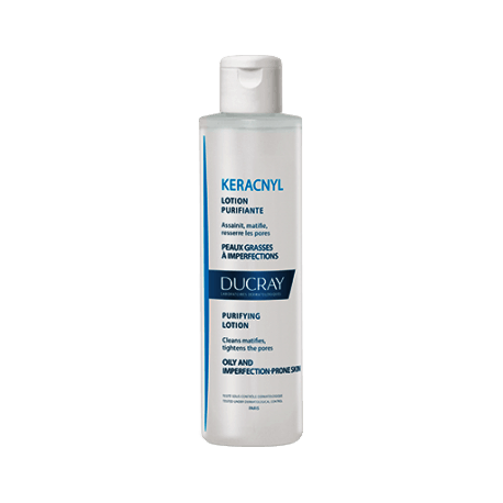 La lotion purifiante Keracnyl est un excellent soin matifiant pour les peaux grasses. Son efficacité repose sur les principaux actifs qui la composent :