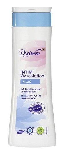 Lotion nettoyante intime Duchesse fraîche à l'extrait de camomille et à l'acide lactique.
