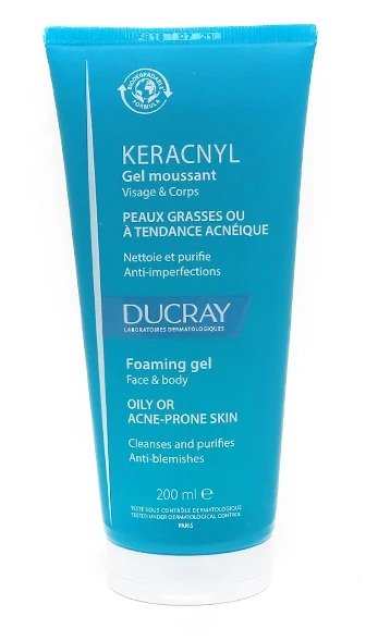 Le gel moussant Keracnyl de Ducray a une action nettoyante et purifiante. Il agit en douceur les peaux à tendance acnéique. Il s’utilise sur le visage et le corps.