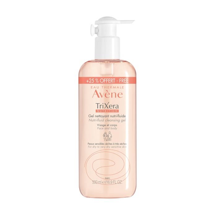 TriXera NUTRITION gel nettoyant nutri-fluide nettoie en douceur, protège du dessèchement cutané et restaure la barrière cutanée des peaux sensibles, sèches à très sèches de toute la famille. Sa formule haute tolérance est riche en Sélectiose (actif breveté Pierre Fabre) et en Eau thermale d'Avène aux propriétés apaisantes et anti-irritantes. Formulé sans savon, il est facile à étaler et à rincer.